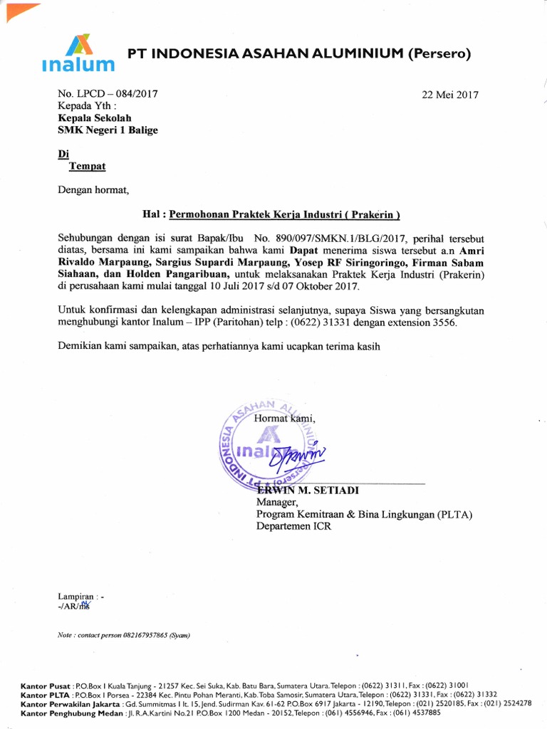 Surat Balasan Pkl : Contoh Surat Balasan Magang Kerja Contoh Surat : Menindaklanjutin surat permohonan praktek kerja lapangan, dengan surat ini kami bersedia memberi kesempatan praktek kerja lapangan ( pkl ) kepada satu murid smk travina prima selama.. Balasan surat permohonan praktek kerja lapangan kepada : Mar 18, 2019 · contoh surat balasan penerimaan pkl jurusan akuntansi. Siapa surat balasan pkl yang baik? The collection that consisting of chosen picture and the best amongst others. Smk travina prima bekasi dengan hormat.